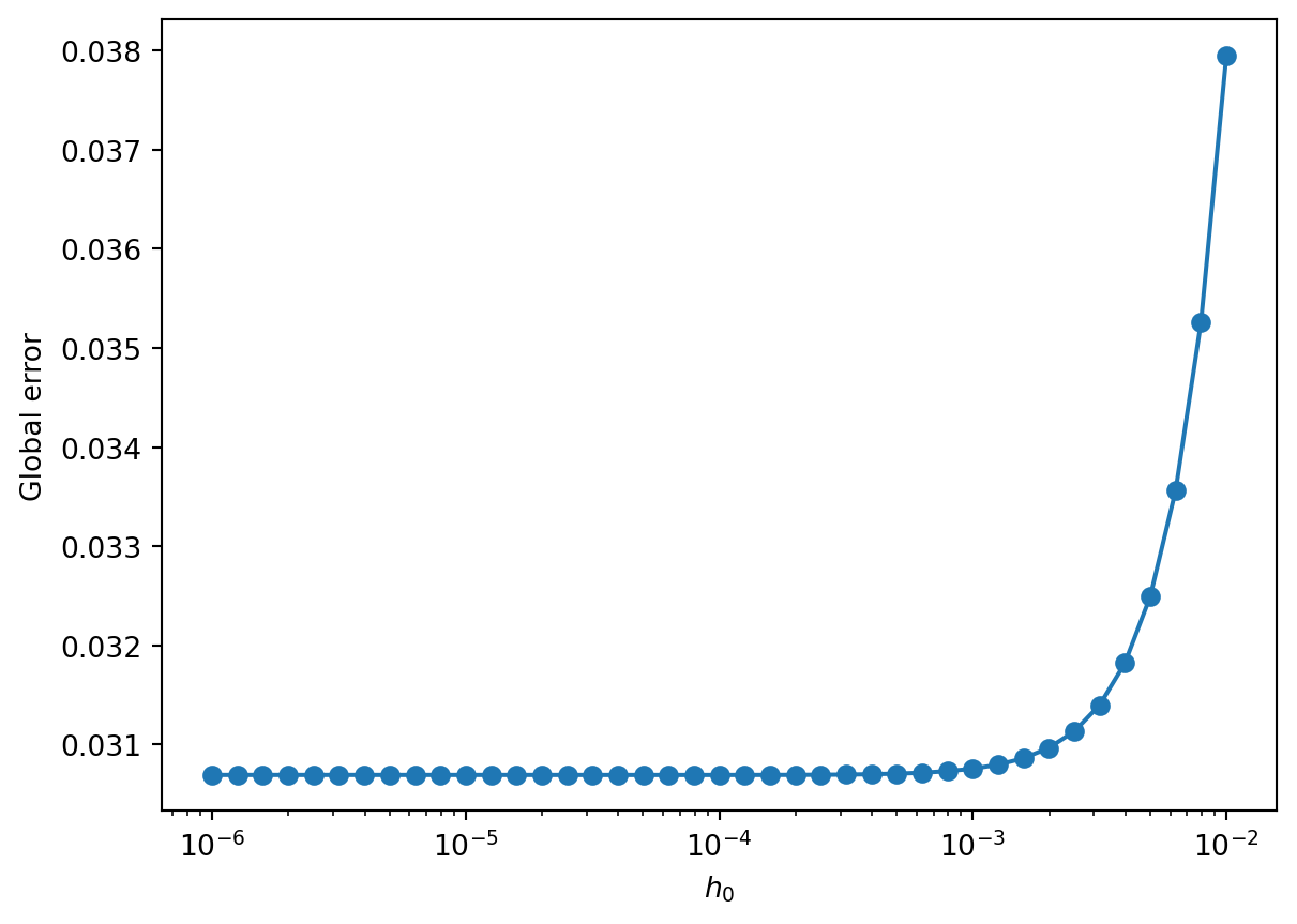 So we see that reducing the size of the first step down from h_0 = h = 10^{-2} reduces the global error down to around h_0 = 10^{-4}. In general, if we make the Euler step an order of magnitude smaller we should bring the local error from this step in line with that of the first Adams-Bashforth steps.